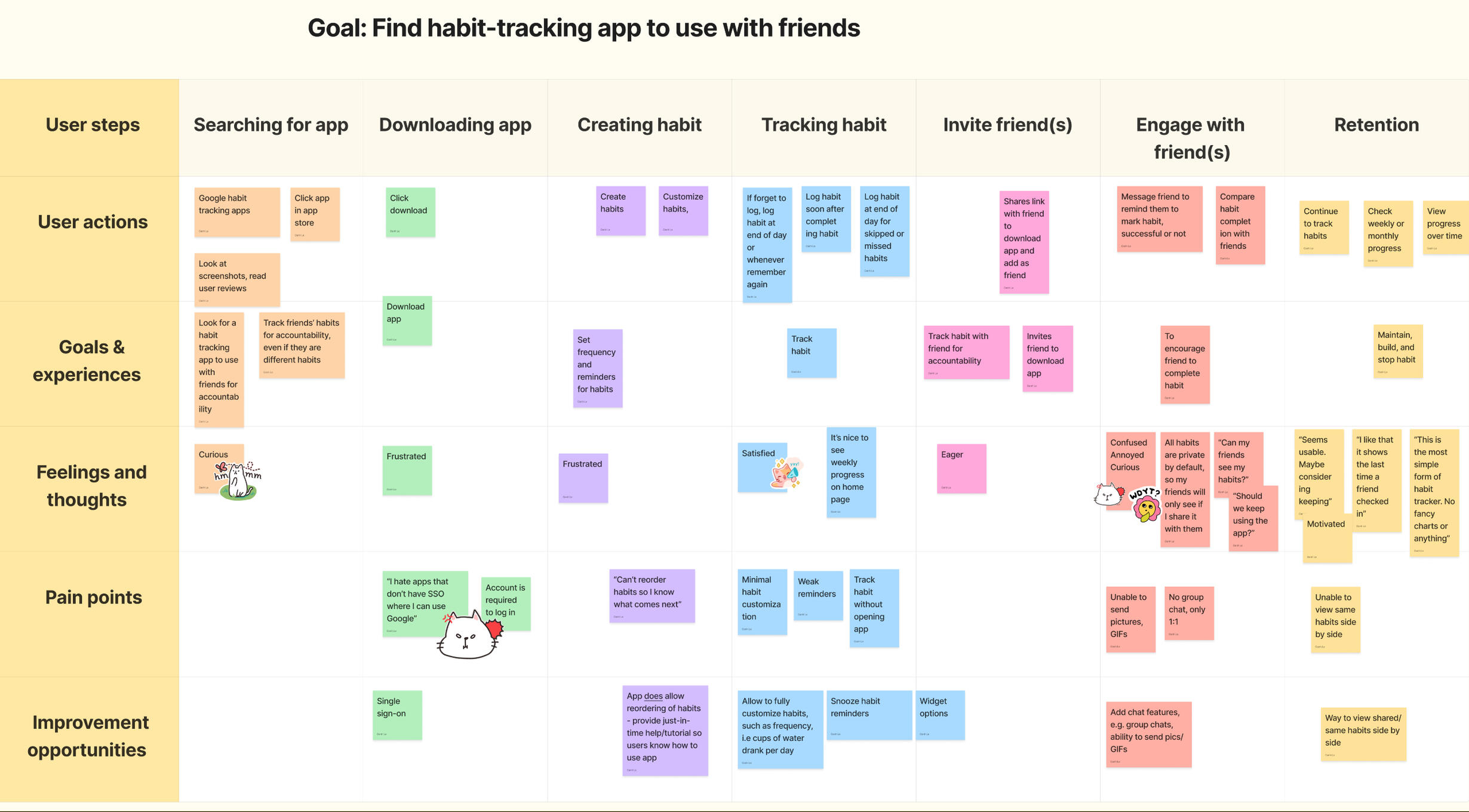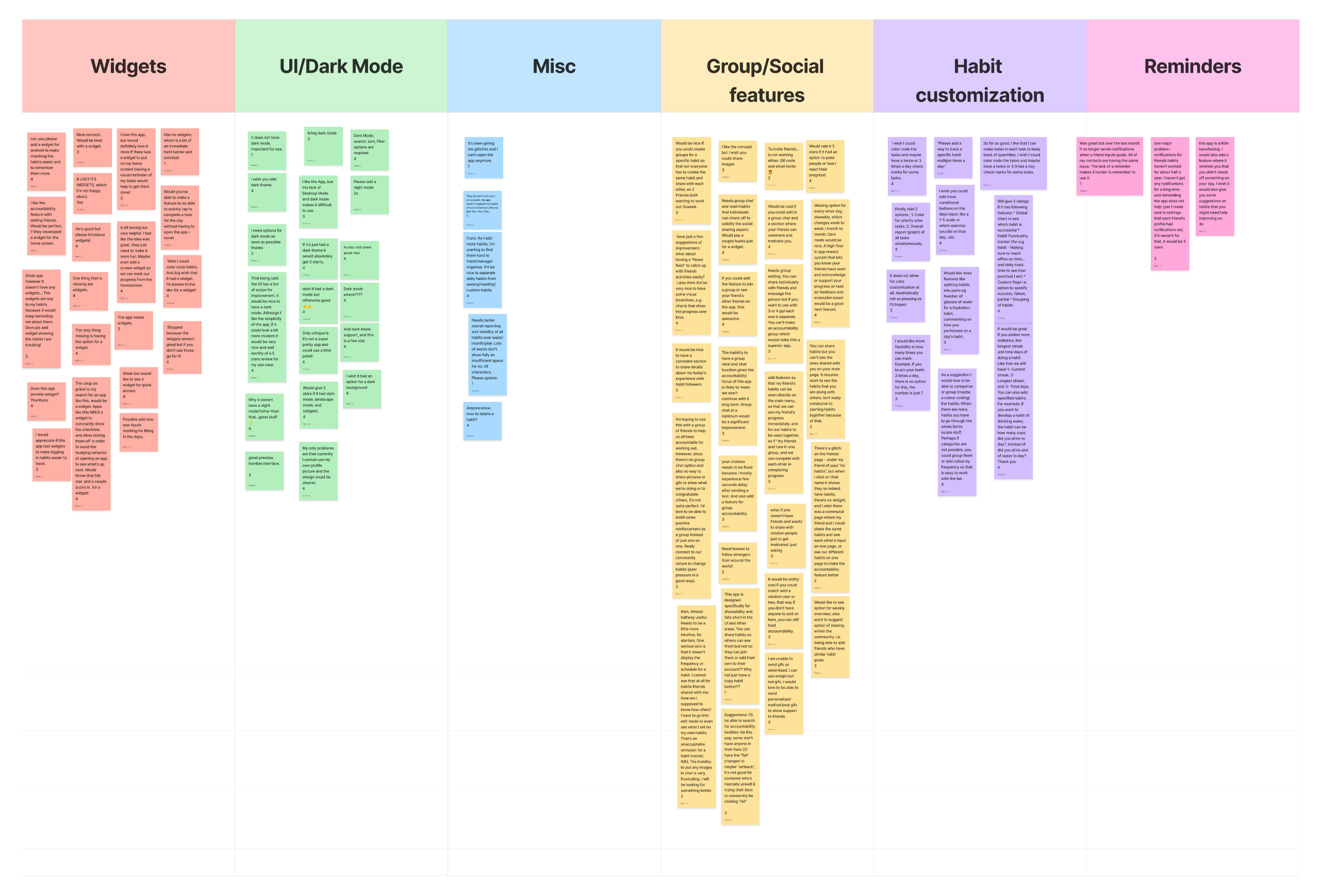 I conducted secondary research using customer feedback, as well as a competitive analysis to identify how HabitShare's competitors meet their users’ needs in relation to their design problems.During my research, I found that users were struggling to effectively engage with their friends. Because it is a social habit tracking app, users were craving more group features, such as creating collaborative habits where they can track together and engage with each other, having a group chat, or engaging with their friends' completed habits.