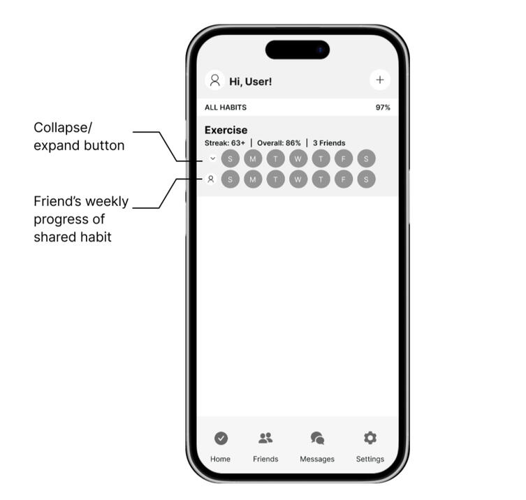 Many users were happy with the weekly tracking display, so instead of changing that layout, I wanted to add to it. My goal for the first design was to show that users could view shared habits side-by-side with friends and compare each other’s progress that way.